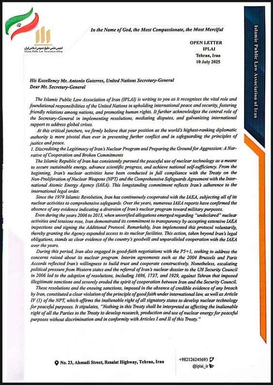 با احترام، انجمن علمی حقوق عمومی اسلامی ایران با توجه به نقش حیاتی و مسئولیتهای محوری سازمان ملل متحد در حفظ صلح و امنیت بینالمللی، ارتقای همکاریهای دوستانه میان ملتها و ترویج حقوق بشر و همچنین وظایف ذاتی دبیر کل سازمان ملل در اجرای قطعنامهها، میانجیگری در اختلافات و جلب حمایت جامعه جهانی برای حل بحرانها، این نامه را خدمتتان ارسال میدارد. ما بر این باوریم که در این برهه حساس تاریخی، نقش جنابعالی به عنوان عالیترین مقام دیپلماتیک جهان در پیشگیری از درگیریهای بیشتر و تضمین عدالت و صلح، بیش از هر زمان دیگری تعیینکننده است.