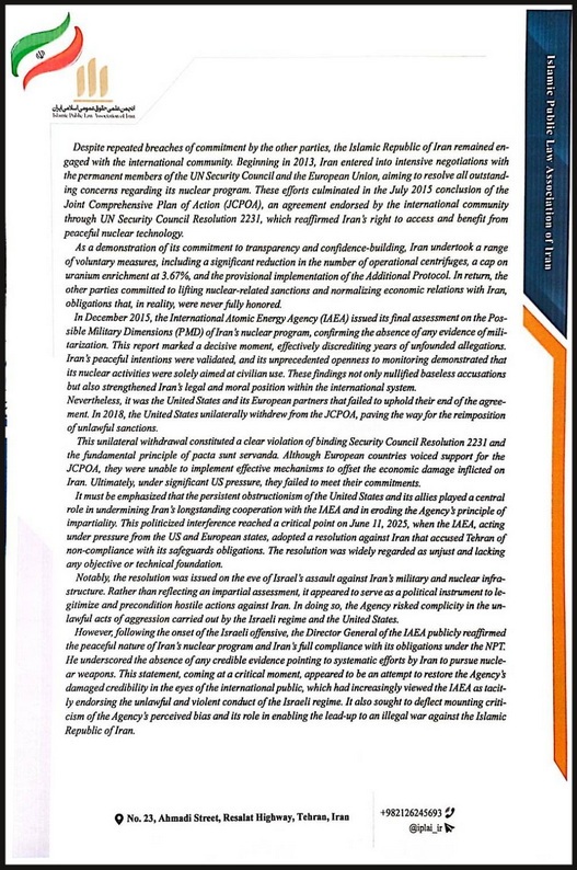 به گزارش مرکز رسانه پژوهشکده شورای نگهبان، انجمن علمی حقوق عمومی اسلامی ایران با ارسال نامهای خطاب به آنتونیو گوترش، دبیر کل سازمان ملل متحد، با اشاره به نقش حیاتی و مسئولیتهای محوری سازمان ملل متحد در حفظ صلح و امنیت بینالمللی، ارتقای همکاریهای دوستانه میان ملتها و ترویج حقوق بشر و همچنین وظایف ذاتی دبیر کل سازمان ملل در اجرای قطعنامهها، میانجیگری در اختلافات و جلب حمایت جامعه جهانی برای حل بحرانها، اجرایی شدن قطعنامه ۴۸۷ شورای امنیت که در سال ۱۹۸۱ با رأی همه اعضا به محکومیت حمله نظامی اسرائیل به تأسیسات هستهای عراق صادر شد را مطالبه کرد.