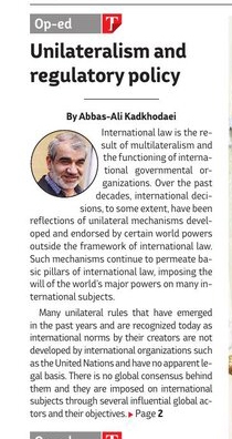 به گزارش مرکز رسانه پژوهشکده شورای نگهبان، دکتر کدخدایی، عضو حقوقدان و رییس پژوهشکده شورای نگهبان با انتشار یادداشتی با عنوان«یکجانبهگرایی و ضابطهسازی» در روزنامه انگلیس زبان تهران تایمز، به تبیین ماهیت اصلی ضابطهسازی های جعلی که با هدف فشار بر دولتهای مستقل در قالب عناوینی چون دستورالعمل، استاندارد، کردارنامه و اعلامیه صورت میگیرد پرداخت که ترجمه فارسی این یادداشت در ادامه میآید.
