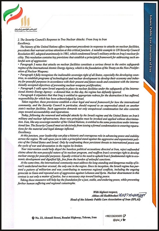 به گزارش مرکز رسانه پژوهشکده شورای نگهبان، انجمن علمی حقوق عمومی اسلامی ایران با ارسال نامهای خطاب به آنتونیو گوترش، دبیر کل سازمان ملل متحد، با اشاره به نقش حیاتی و مسئولیتهای محوری سازمان ملل متحد در حفظ صلح و امنیت بینالمللی، ارتقای همکاریهای دوستانه میان ملتها و ترویج حقوق بشر و همچنین وظایف ذاتی دبیر کل سازمان ملل در اجرای قطعنامهها، میانجیگری در اختلافات و جلب حمایت جامعه جهانی برای حل بحرانها، اجرایی شدن قطعنامه ۴۸۷ شورای امنیت که در سال ۱۹۸۱ با رأی همه اعضا به محکومیت حمله نظامی اسرائیل به تأسیسات هستهای عراق صادر شد را مطالبه کرد.